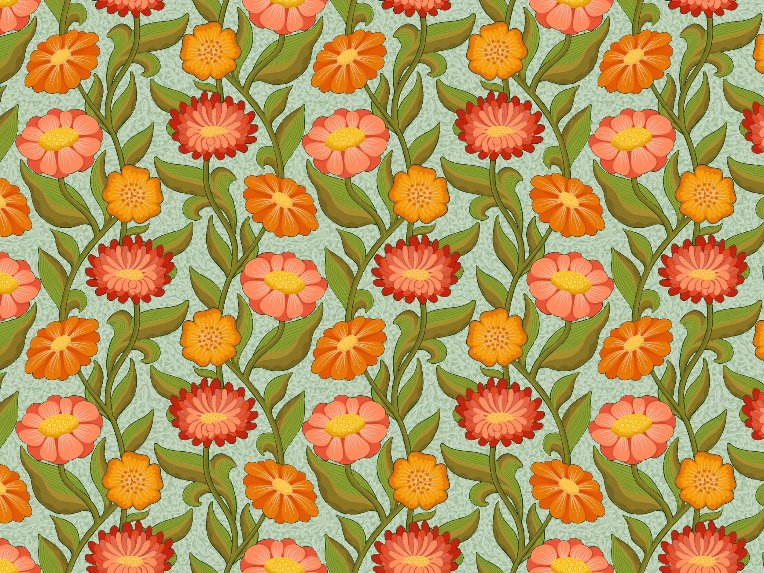 Inspired by historic decorative tilework, Briarwood Floral Tile features three floral motifs and three foliage forms arranged in a balanced, repeating layout. A warm palette of olive, sea foam, coral, red, mustard, and peach evokes handcrafted ceramics and Arts & Crafts ornament. Ideal for wallpaper, accent fabric, and décor, this pattern adds structure and heritage charm to any project.
