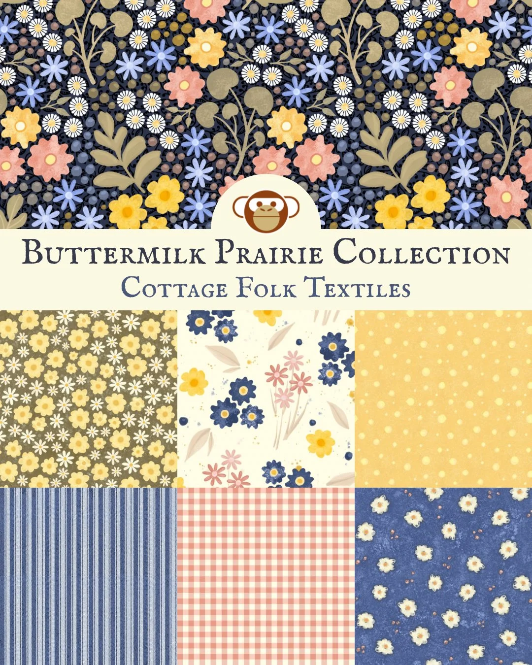 At its heart, Buttermilk Prairie explores the structure of traditional calico โ small-scale florals, rhythmic repeats, and timeless motifs โ reimagined with modern clarity and thoughtful spacing. Classic coordinates like ticking stripes, gingham, and scattered dots balance the florals, creating a versatile fabric story designed for quilting, apparel, and home dรฉcor.