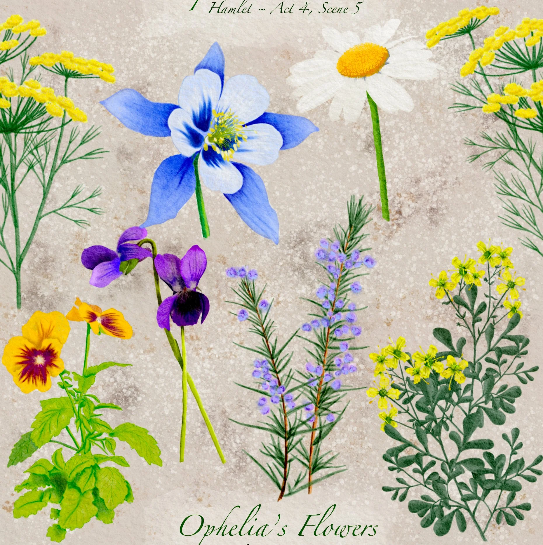 Rosemary, to remember her dead father, Polonius. Pansies come from the French, pensées, for thoughts. Fennel means infidelity and columbine flatters with insincerity. Rue is bitter and means regret, repentance and sorrow. Daisies for innocence. And, now withered, violets mean faithfulness. ~ Hamlet, Act 4, Scene 5
